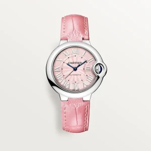 Ballon Bleu de Cartier blue balloon watch, 33 mm model, self-winding mechanical movement. Stainless steel case, fluted crown, inlaid with a synthetic spinel cabochon, pink dial, Roman numeral hour markers, sword-shaped blued steel hands, sapphire crystal, pink alligator leather strap, stainless steel folding watch buckle. Case size: diameter: 33 mm, case thickness: 9.96 mm. Water-resistant to 3 bar (approximately 30 meters).
