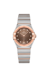 This 28 mm watch is made of Sedna 18K gold and stainless steel. The bezel is engraved with Roman numerals, the brown sun-patterned dial is decorated with diamond hour markers and is covered with a wear-resistant sapphire glass. The hands, Omega brand logo, constellation logo and diamond bracket are also made of Sedna 18K gold.